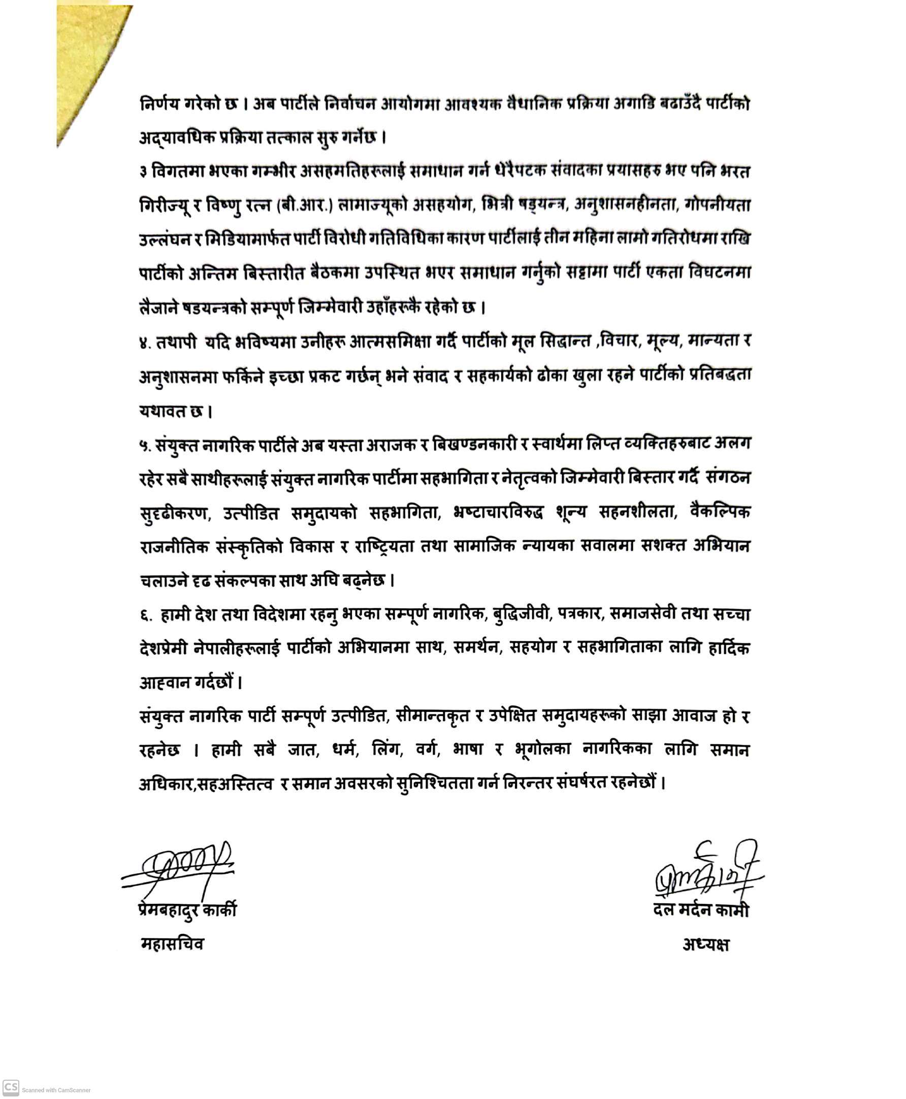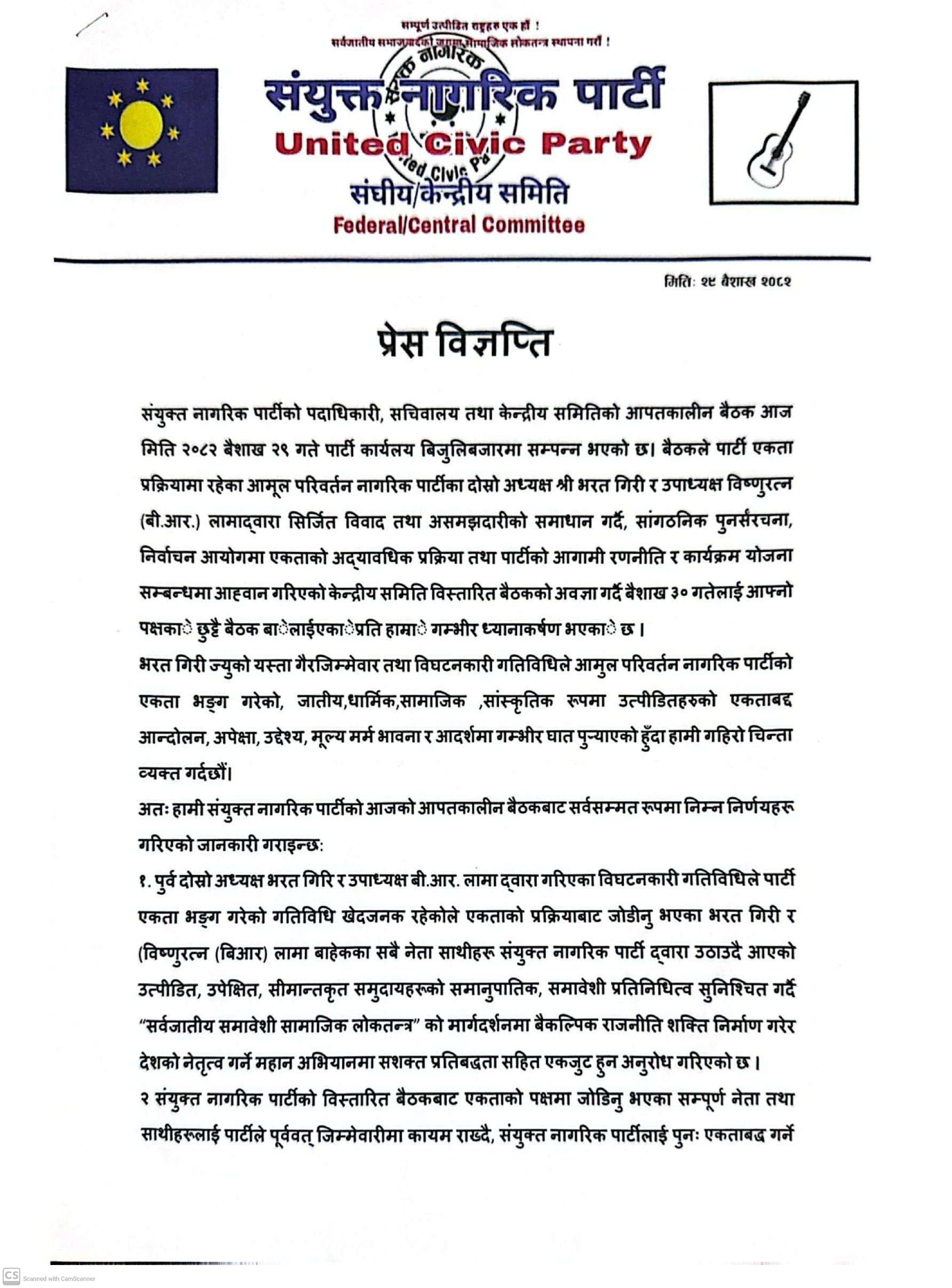 नेपालको सामाजिक न्याय, समानता र समावेशी नेतृत्वको स्पष्ट एजेन्डा बोकेको संयुक्त नागरिक पार्टी र आमूल परिवर्तन रिपब्लिकन पार्टीबीचको एकता पछि बनेको “आमूल परिवर्तन नागरिक पार्टी” भित्रको आन्तरिक विवाद, विभाजनकारी नियत तथा असहयोगी व्यवहारका कारण पार्टीका दोस्रो अध्यक्ष भरत गिरि र उपाध्यक्ष विष्णुरत्न लामालाई पार्टी नेतृत्वलाई अलग राखी आमूल परिवर्तन नागरिक पार्टी”मा जोडिएको सबै नेताकार्यकर्तालाई साथमा लिएर अगाडि बढने निर्णय गरेको छ।