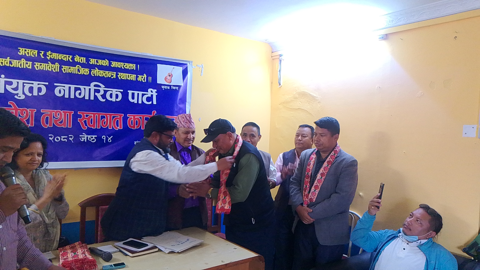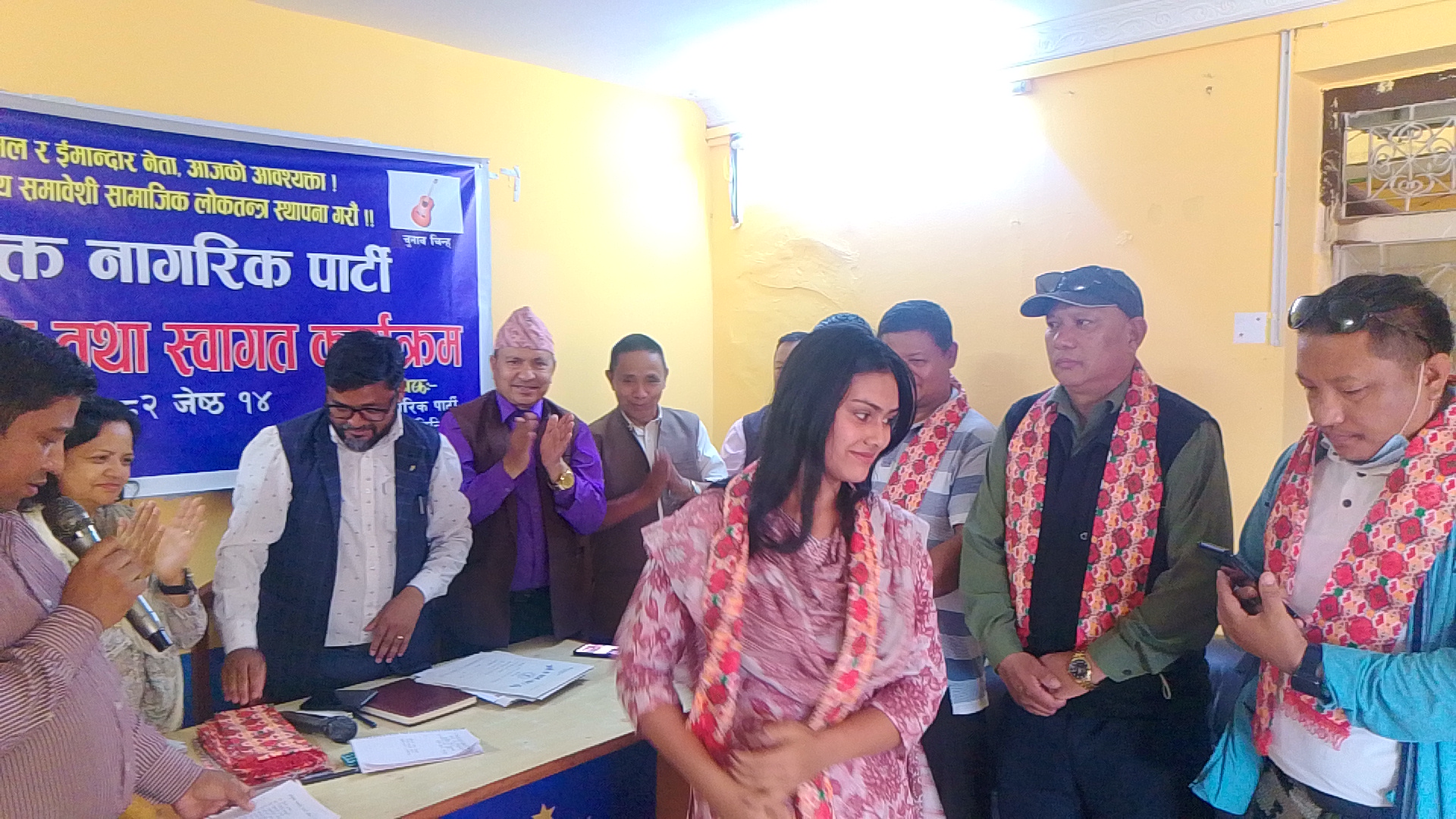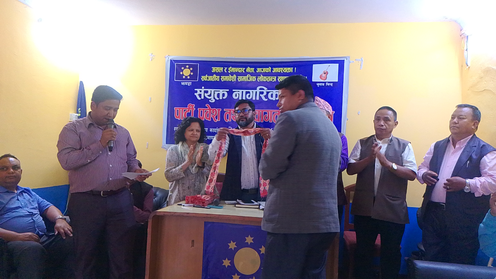 पार्टी प्रवेश तथा स्वागत कार्यक्रममा विभिन्न पार्टी परित्याग गरि आउनुभएको आगन्तुकहरुलाइ पार्टी अध्यक्ष, महासचिव, कोषाध्यक्ष,उपध्यक्ष लगायत नेताहरूले खदालगाएर स्वागत गर्नु भएको थियो।
