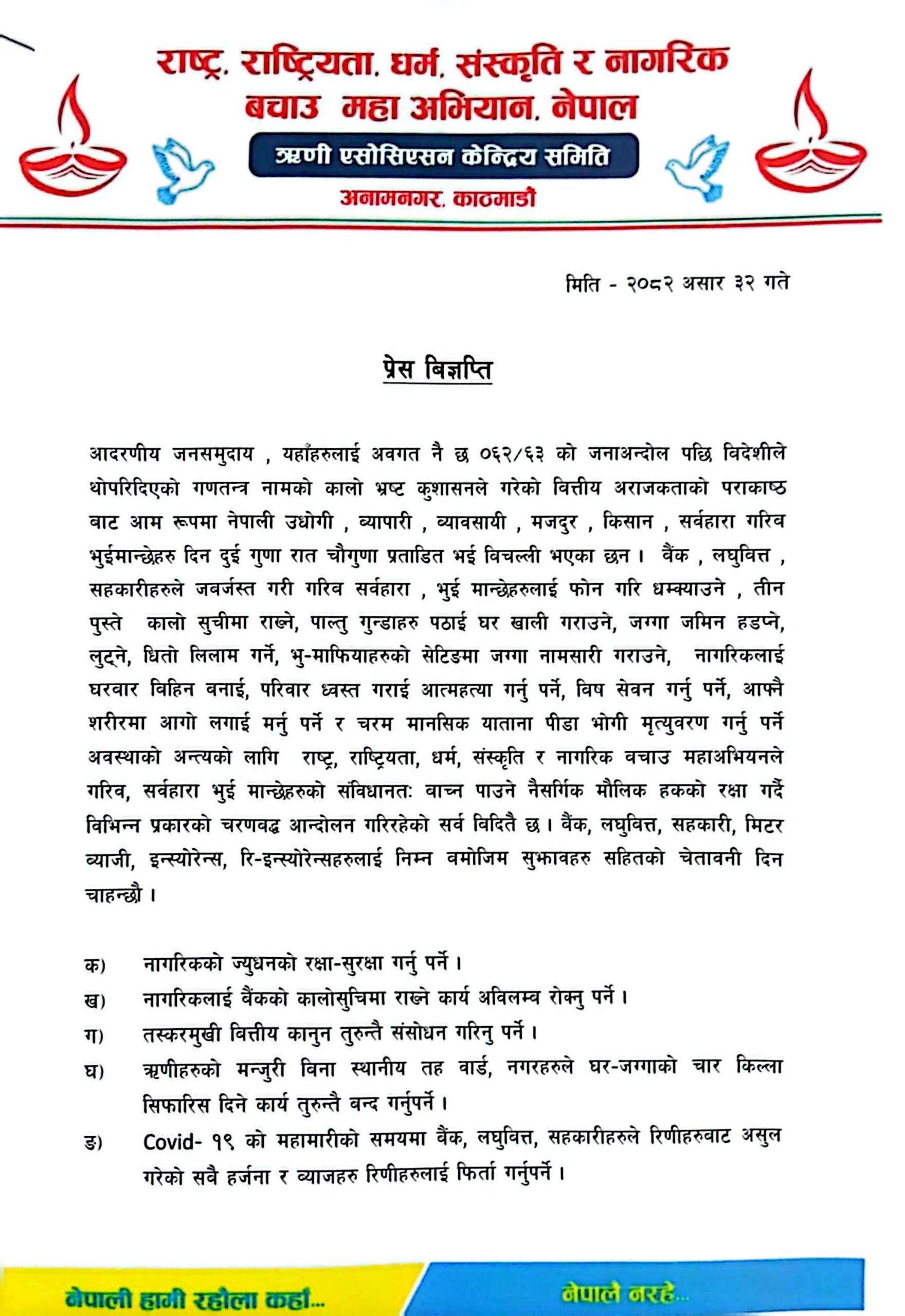 ‘राष्ट्र, राष्ट्रियता, धर्म, संस्कृति र नागरिक बचाऊ महाअभियान नेपाल’ अन्तर्गत ऋणी एसोसिएसन केन्द्रीय समितिले बैंक, लघुवित्त, सहकारी तथा सूदखोरहरूमाथि कडा चेतावनीसहितको प्रेस विज्ञप्ति जारी गर्दै जनतालाई ‘आत्मरक्षा’का लागि खडा हुन अपील गरेको छ। अनामनगर, काठमाडौंमा बसेको समितिको आपतकालीन बैठकले वित्तीय अत्याचार विरुद्ध जनस्तरमै विद्रोहको तयारी भइरहेको उल्लेख गरेको छ।