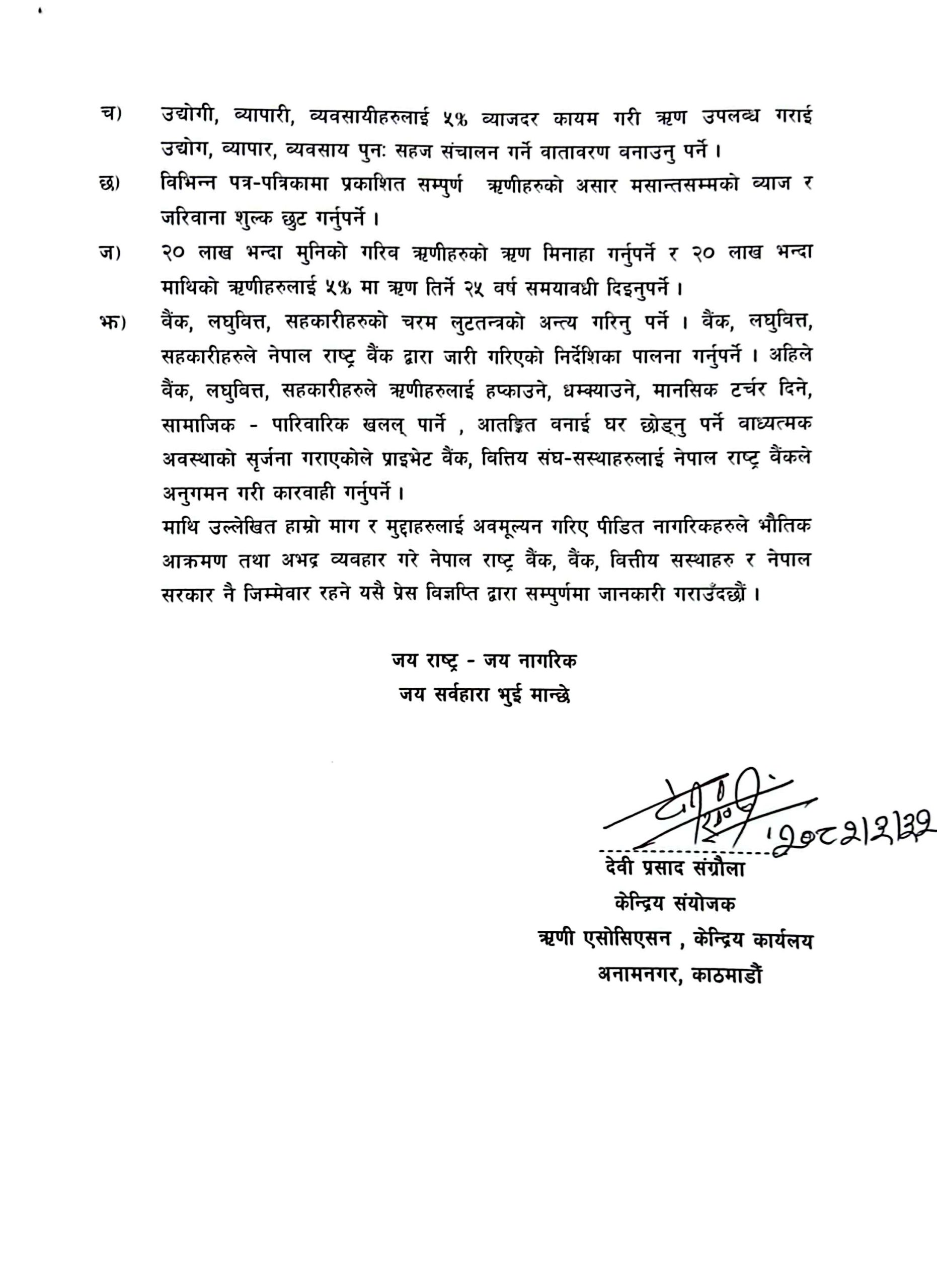 ऋणी एसोसिएसनले भन्यो— अब हाम्रो धैर्यको सीमा सकिएको छ। यदि माथिका माग तत्काल सम्बोधन भएनन् भने, नेपालभर जनविद्रोहको ज्वाला सल्कनेछ। घरबार विहीन, ऋणले थिचिएका, समाजबाट बहिष्कृत नागरिकहरू अब चुप बस्ने छैनन्।